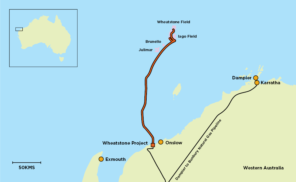 惠斯通和附近的Iaga天然气资源位于澳大利亚州西澳大利亚州的南威尔巴州北部约225公里。朱米马和Brunello字段还绑在中央加工平台上。